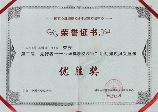 beat365官网2021级高儒嫣同学荣获第二届“先行者-心理健康校园行”活动知识风采展示优胜奖
