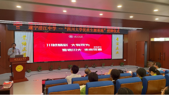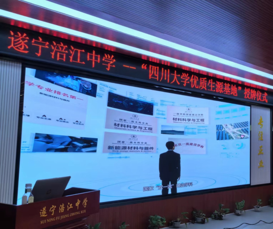 黄科老师拜访了遂宁涪江中学,与分管教学教研周剑副校长、高一、高二、初三“清北班”拔尖学生进行了深入交流和招生宣讲,并代表学校授予遂宁涪江中学“优质生源基地”牌匾。周副校长感谢beat365中文官方网站对于遂宁涪江中学在教育教学和人才培养方面取得的成绩认可,愿与beat365中文官方网站就拔尖创新人才大中小培养体系的建立进行探索和合作,鼓励遂宁涪江中学的学生积极报考beat365中文官方网站,为川大输送更多优秀人才。黄科老师详细介绍了beat365中文官方网站的悠久历史、学科实力、人才培养模式与特色、毕业生发展前景、校园环境和各项资源等,就强基及各种专项进行了讲解。最后结合个人经历,介绍了川大beat365中文官方网站、增材制造研究现状,并回答了同学们的各种问题,现场反响热烈,赢得阵阵掌声。最后为老师同学们赠送了川大纪念品,并合影留念。